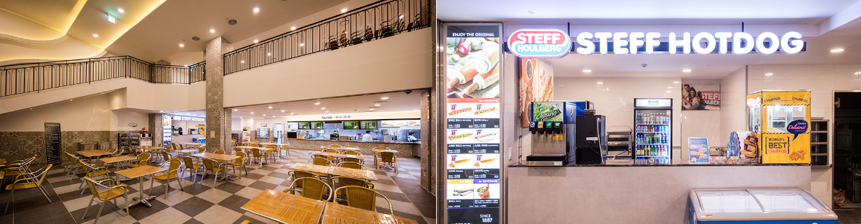 한식, 양식, 푸드코트, 스테프 핫도그가 입점되어 있는 씨랄라 푸드코트입니다. 요금은 락카키로 결제하고 후불정산입니다. 메뉴로는 새우볶음밥, 한방갈비탕, 김치전골, 불고기 버섯전골, 해물 짜장면, 등심돈가스, 고구마 치즈 돈가스, 어린이 돈가스, 튀김 떡볶이, 어묵탕, 새우튀김우동, 불고기 피자, 견과류 닭강정, 순살 치킨, 전복죽, 계란 야채죽, 육개장 칼국수 등이 있습니다.