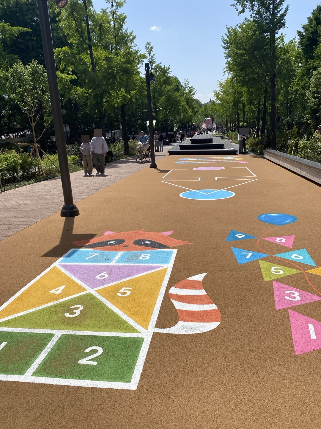 그 전에는 넓은 광장느낌이라 킥보드 타는 재미가 있었다면 지금은 어린이들이 정말 좋아할만한 바닥놀이(사방치기와 오징어게임)가 그려져 있었습니다. 이 외에도 앉아서 쉴 수 있는 공간도 많이 생겼더라구요. 어린이 대공원은 유모차, 휠체어등을 제외한 바퀴가 있는 건(자전거, 킥보드, 반려동물, 전동휠, 인라인스케이트, 리모컨조종자동차(드론포함)) 입장할 수 없는데요, 가져오셨다면 입구에 맡기고 들어가시면 됩니다.